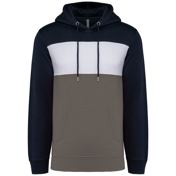 Sweatshirt capuche tricolore avec bande blanche centrale sur toutes les couleurs.