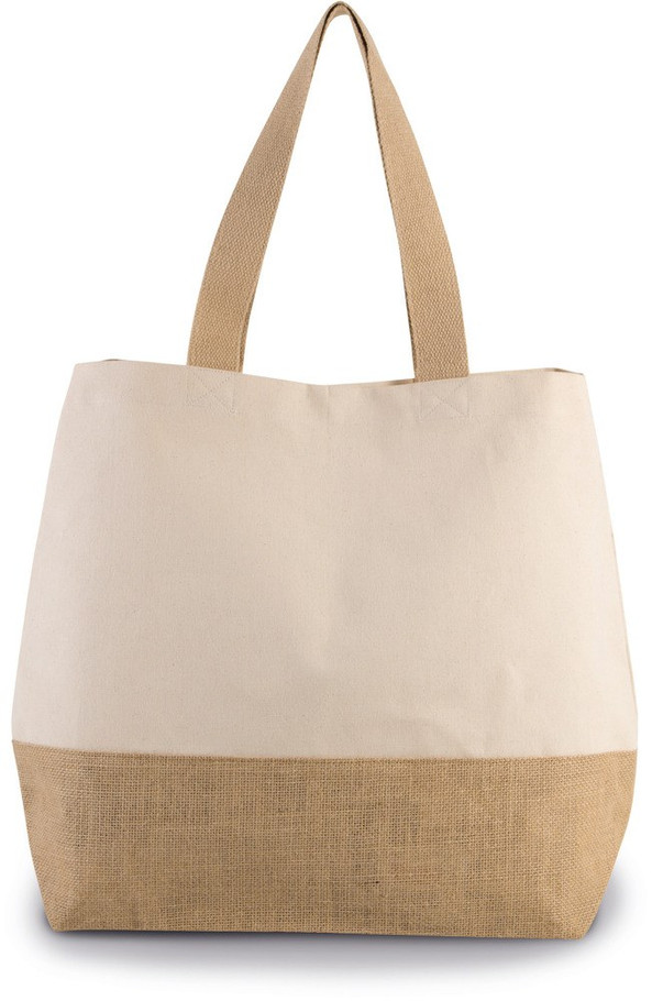Il s'agit d'un sac en coton avec un fond laminé en toile de jute naturel.