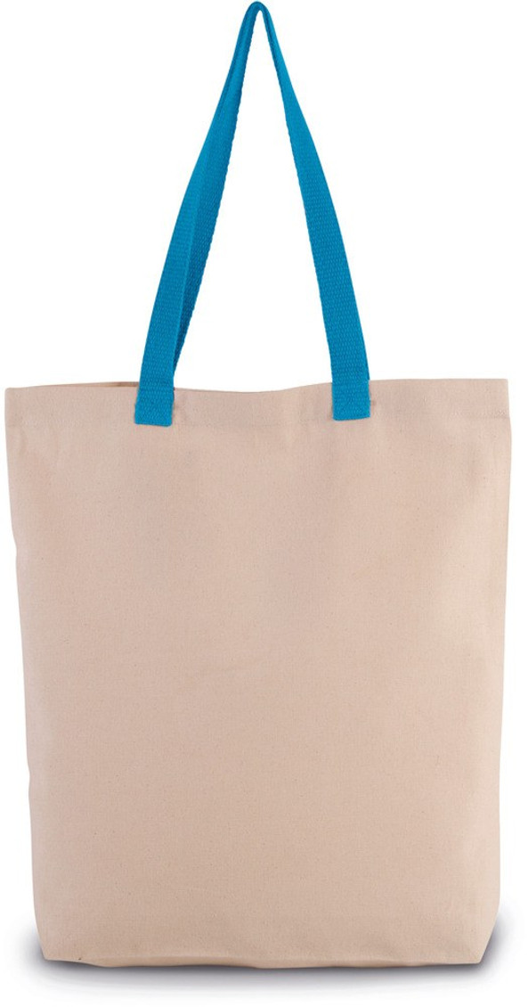 Ce sac shopping classique à soufflet en toile de coton d'un grammage de 220 g/m² a une couleur uni naturelle, par contre, ses poignées sont contrastées.