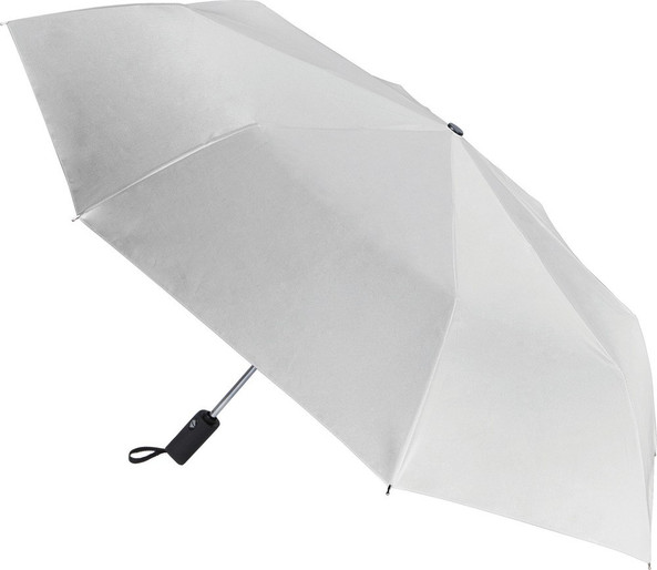 Mini parapluie 21" (54 cm) pliable en 3 parties, ouverture et fermeture automatique, mât en métal, baleines en aluminium, poignée en gomme, toile 100% pongé de polyester, embouts de baleine en métal.