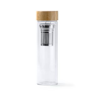 Bouteille en verre borosilicate à double paroi avec couvercle en bambou.