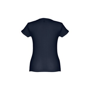 T-shirt ceinturé pour femme en maille jersey 100% coton (150 g/m²) avec fil de coton cardé (couleur 183: 90% coton/10% viscose, couleur 196: 98% coton/2% viscose). Contient un col fin en jersey double avec un ruban de renfort en satin. Pièce coupée et cousue avec double couture sur les manches et le bas