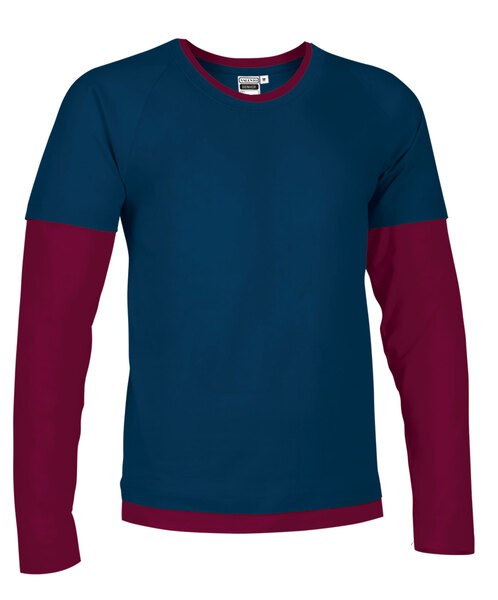 T-shirt col rond,bicolore avec effet double manches.Fabriqué en tissu 100% coton ring Spun doux et confortable. Manches col et bas en couleurs contrastées avec effet double t-shirt. Col rond en bord-côte élastique qui s’adapte confortablement. Bande intérieure dans le cou qui renforce sa structure et réduit la déformation. Convient pour diverses méthodes de marquage : sérigraphie, broderie, transfert, vinyle. Idéal comme textile publicitaire, vêtement décontracté et souvenir.