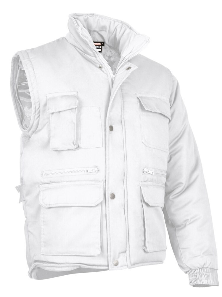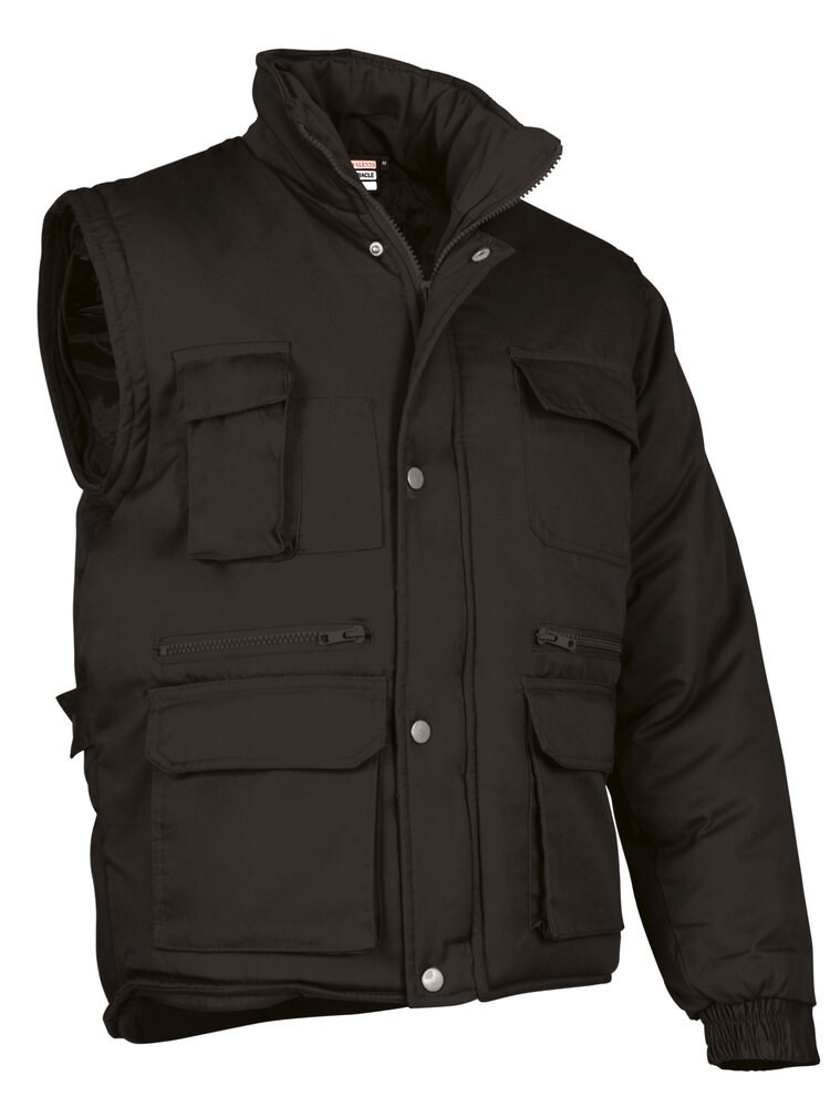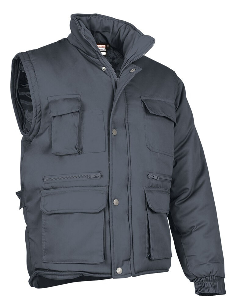 Blouson avec manches amovibles convertible en gilet. Fabriqué en tissu sergé résistant et durable à l’extérieur, doublure intérieure lisse, matelassé pour plus de rétention thermique. Blouson facilement convertible en gilet en enlevant les manches qui sont reliées par des zips. Ceinture réglable par pression pour un meilleur ajustement, dos plus long et zone lombaire protégée. Deux poches frontales à soufflets et deux poches supérieures avec fermeture par rabat et velcros, deux poches latérales, deux poches à mi-hauteur avec zip, un logement stylo et une poche intérieure avec velcro pour tout avoir à portée de main. Zip intérieur dans le dos pour faciliter le marquage : sérigraphie, broderie, écussons, transfert, vinyle. Idéal comme vêtement de travail, vêtement professionnel et textile publicitaire.