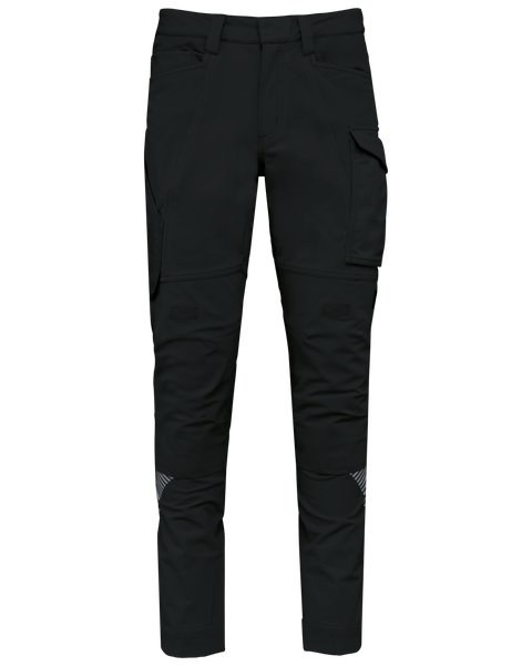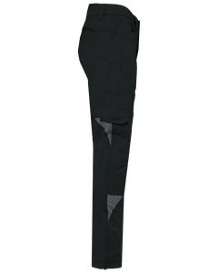 2 poches genouillères en Cordura® stretch 92% polyamide, 8% élasthanne ton sur ton (genouillères non fournies) avec bande auto agrippante et rabat intérieur pour maintenir et adapter la genouillère.